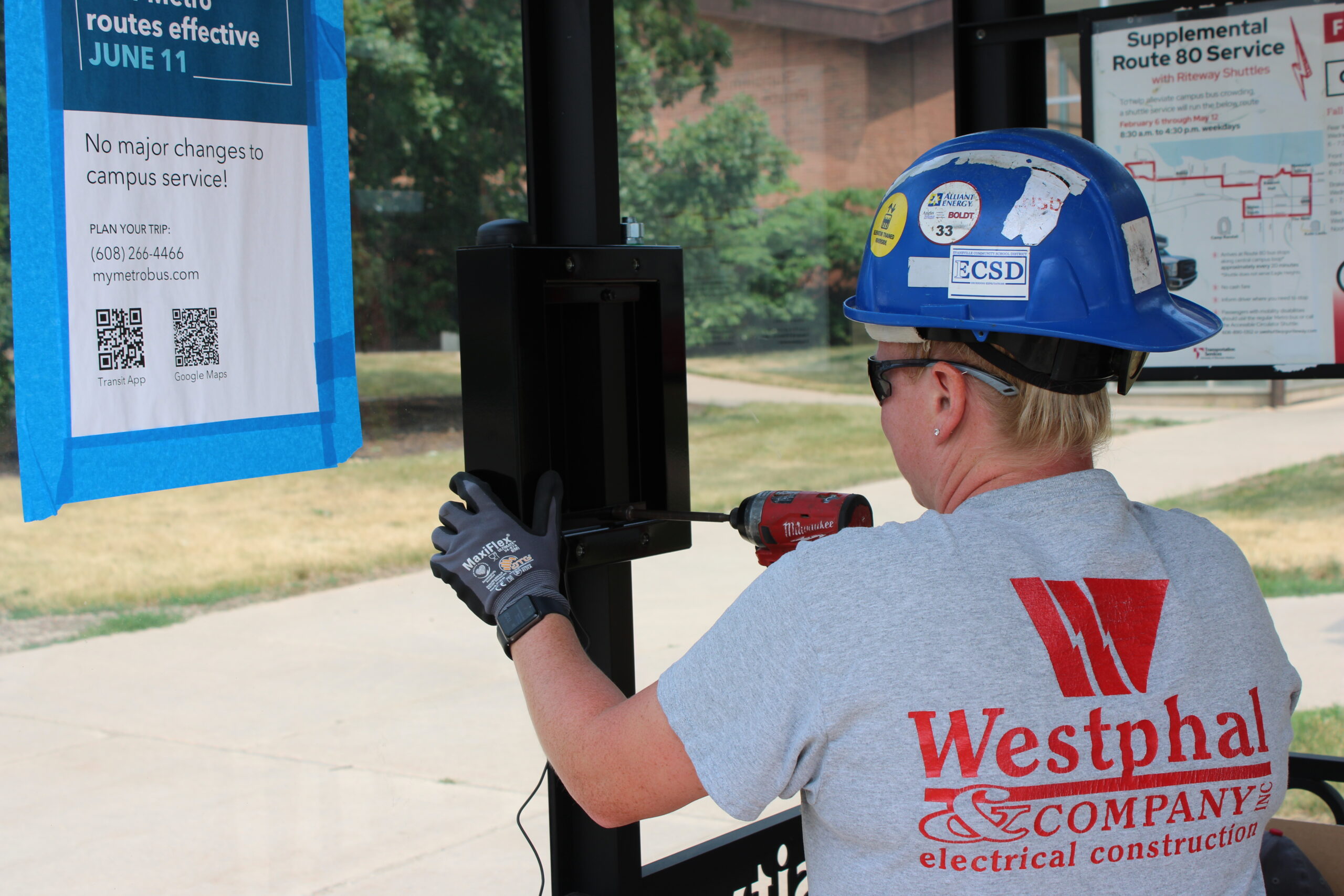 Westphal significantly contributed to the University of Wisconsin-Madison’s transit system by providing installation services for 11 bus shelters. This project not only improved the aesthetic and functional aspects of the bus stops but also introduced a sustainable energy solution. By adhering solar modules atop these shelters, Westphal has enabled the harnessing of solar energy to charge batteries that power the bus schedule display screens. This eco-friendly approach ensures that commuters at UW Madison have access to real-time bus schedules while promoting the use of renewable energy sources, thus marking a significant step towards sustainable urban transit solutions. Check out the photos of the project below.